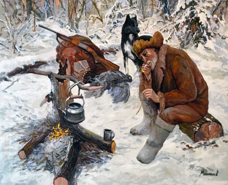 Однажды как-то Дмитрич и его друзья избушку ставили охотничью. Спали несколько ночей в палатке. И каждую ночь все шестеро слышали, как поскрипывает снег под чьими-то шагами. Они, бывалые и много чего видавшие охотники, так и не смогли определить на слух, чьи это были шаги. А выходят из палатки – словно никто и не ходил, снег чистый, как только что постиранная белая простынь. В другой раз, говорит Савельев, его медведь спас. Только охотник устроился на ночлег, смотрит, в дверь избушки к нему топтыгин ломится. Савельев – косолапому: «Уходи, Мишка! Нечего тебе здесь делать». А медведь и отвечает Савельеву человеческим голосом: «Не хочешь пускать в двери, залезу через окно!» Уже по грудь медведь влез в окно, тут от страха охотник и… проснулся. Смотрит, а дверь в избушку открыта. С вечера было жарко, он и приоткрыл дверь, а закрыть забыл, заснул. Если бы не этот сон, точно замёрз бы к утру. Как вспомнит эту историю Николай Дмитрич, так всякий раз и благодарит медведя за свое чудесное спасение.