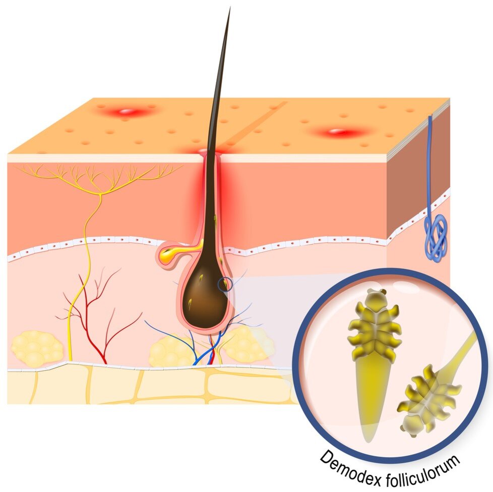 Как известно, продуктами питания клеща являются клетки эпителия волосяных луковиц и сальных желез, а также секрет сальных желез. Демодекс разрушает клетки кожного покрова своими хелицерами (челюстями), что в дальнейшем приводит к образованию воспалительных инфильтратов, кератинизации, пигментации. С увеличением продуктов метаболизма клещей в организме хозяина, создаются входные ворота для инфекции.Таким образом, демодекс выступает в роли химического и механического раздражителя, вызывая развитие патологических процессов в коже.