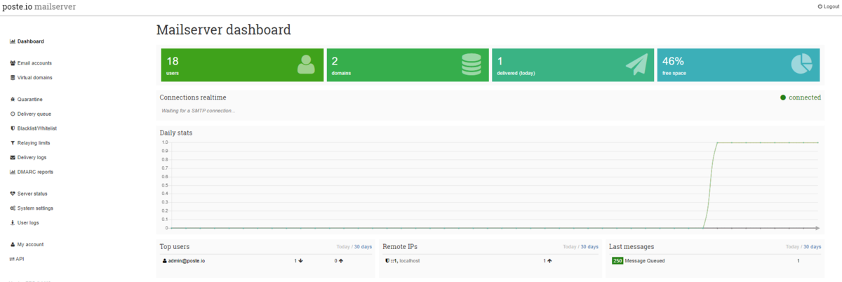 Poste.io это аналог IredMail, для быстрого развертывания полнофункционального почтового сервера за пару минут в контейнере docker. Продукт разработан с оптимальными настройками по умолчанию, чтобы быстро начать работу, не зная внутренностей и не принимая решений, которые могут сломать систему электронной почты.