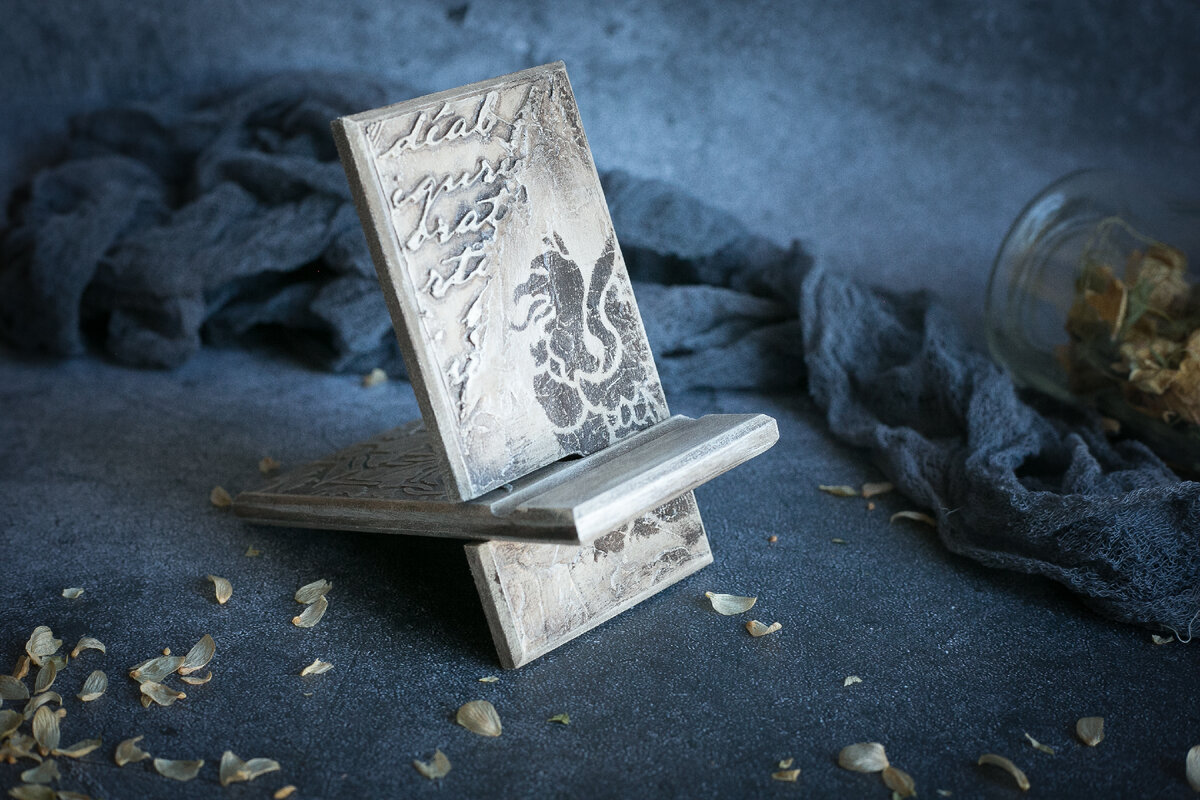 Сегодня предлагаю вам вместе задекорировать подставку для телефона. Нам понадобятся пластиковые эелементы и трафареты от Ivanna Moon Decor. Саму заготовку можно купить на сайте yadecorshop.ru Пластиковый элемент с надписями легко режется ножницами. Я отметила два кусочка карандашом, нагрела феном и отрезала. Приклеила пластик на клей Момент Монтаж Жидкие гвозди. Далее беру шпатлевку по дереву и делаю фактуру на свободном пространстве. В месте где на заготовке прорезь фактура не нужна, чтобы заготовка легко собиралась и разбиралась. На обратной стороне заготовки я делаю трафаретный орнамент все той же шпатлевкой. Наношу шпатлевку не на весь рисунок, чтобы орнамент прерывался неравномерно. После высыхания шпатлевки я слегка ошкуриваю работу, протираю от пыли и окрашиваю в светлый оттенок с обеих сторон. Теперь делаю проливку коричневой краской. Для этого я набрызгала на поверхность воды и кисточкой наношу разбавленную водой коричневую краску. Распределяю краску кистью, более плотный сл