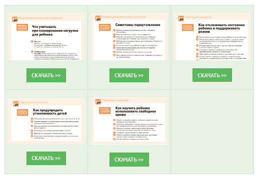 Предлагаем пять памяток, в которых собраны все рекомендации, чтобы правильно распределить нагрузку дошкольника. Раздайте памятки родителям и воспитателям. Так вы предотвратите переутомление детей и укрепите их нервную систему, иммунитет. Памятки для родителей и воспитателей Скачать памятки >>>