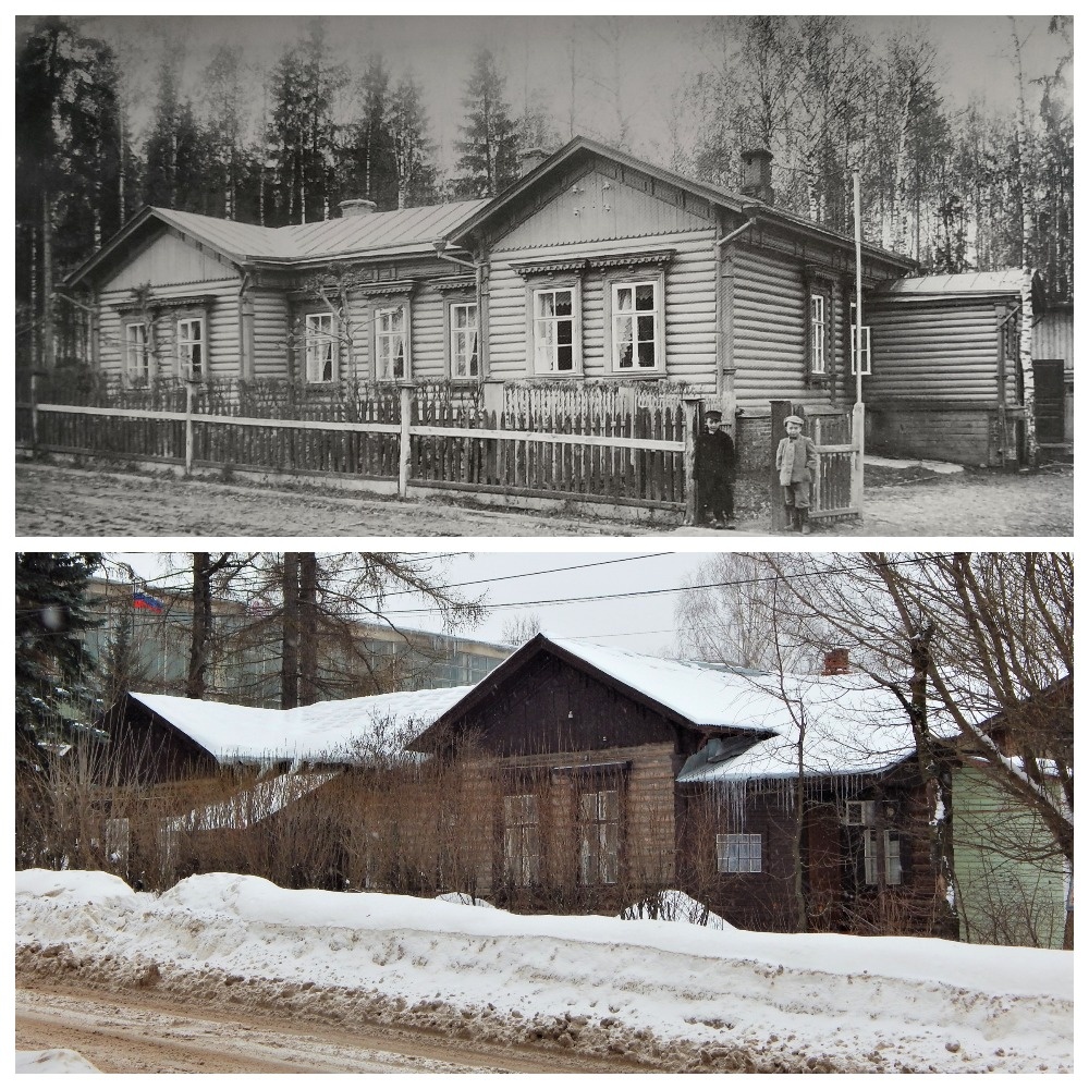 Старый деревянный жилой дом № 75. Построили его в 1897 году. Дому уже 126 лет–неплохо сохранился! Предполагаю, что на старом снимке изображен именно этот домик, только сейчас он немного перестроенный. Думаю, что справа–это пристрой, а вместо одного окна сделали входную дверь с крыльцом. Оригинальный фасад многих домов на этой улице не сохранился. Фасад обшили сайдингом и современным деревом. Также заменили старые окна на пластиковые. Какие-то подобные дома уже давно снесены.