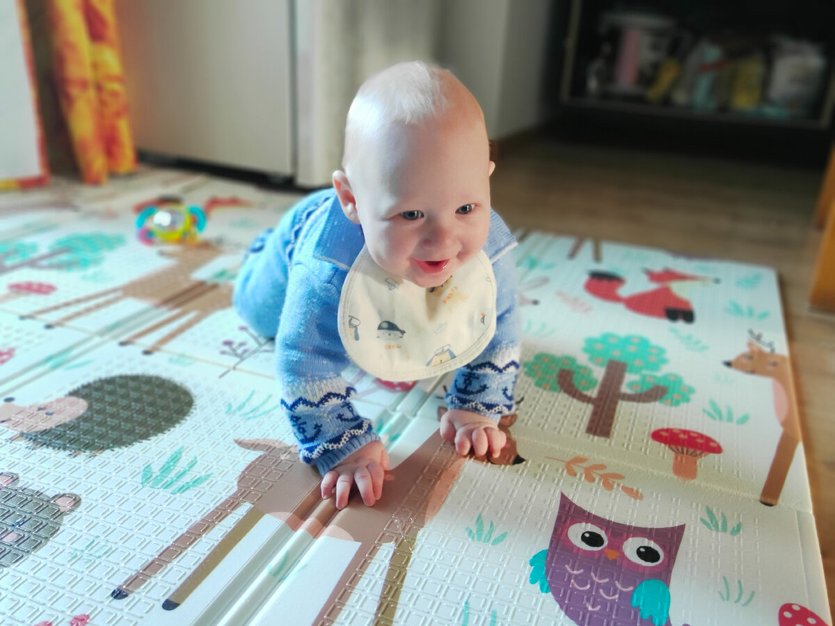 Конечно, он бы с радостью пополз или сам пошел, если бы мог, но и качание доставляет ему неизменное удовольствие. Вадима веселит и качание на детском коврике, тем более что можно передвигаться по полу вместе с ним. Но в кровати всё равно круче — от такого напора она кряхтит, стонет и поскрипывает.