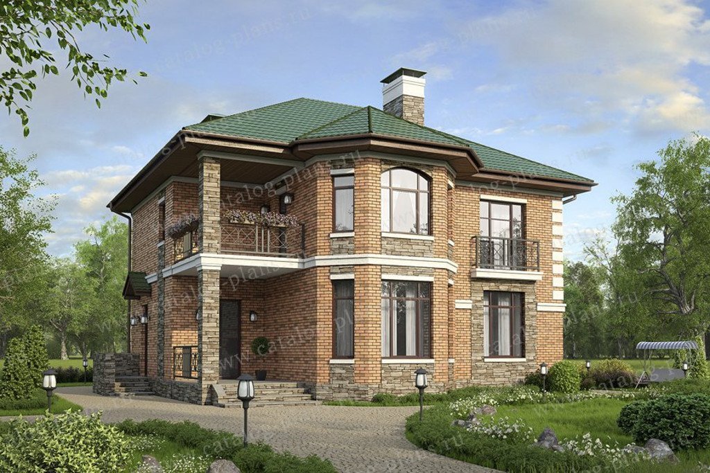 Общая площадь проекта составляет 155 квадратных метров, габаритные размеры дома: 11х10 метров. Проект выполнен в скандинавском стиле, что нашло отражение как в отделке фасадов лицевым кирпичом, так и в использовании декоративного камня для облицовки эркера. Чердачная крыша дома покрыта металлочерепицей.