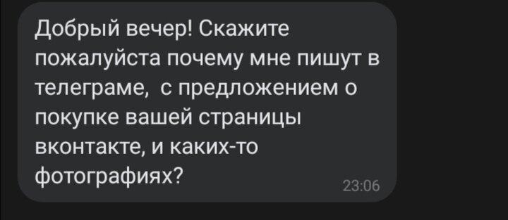 Приветствую Вас на канале "Дневник рукодельницы" Сегодня со мной случилась неприятность. Мою страницу в контакте взломали. Но это пол беды. Мошенники её пытались продать...... Как вы думаете кому? МНЕ!!! Я до сих пор мягко говоря в шоке. Пароль конечно поменяла. Но успела пообщаться с этими странными людьми и вк и в телеграмм. Не сложным пособом мы смогли выяснить, что это пишет один и тот же человек. Сначала я думала, кому это надо. Но муж успокоил меня и сказал, что скорее всего по логике таких жертв как я много. И человек просто зарабатывает на наивных дурочках. И знаете, ни слишком то дорого они оценили мою страницу, всего в 2000 рублей. Они даже подсказали мне для чего можно использовать мою страницу. Я в растерянности. И не знаю как поступить. В подобных ситуациях я никогда не была. Я ни медийная личность, ни звезда. Что то компроментирующее против меня они выдвинуть не смогут. В общем вечер у меня "удался" Остерегайтесь мошенников и не ведитесь на провокации.