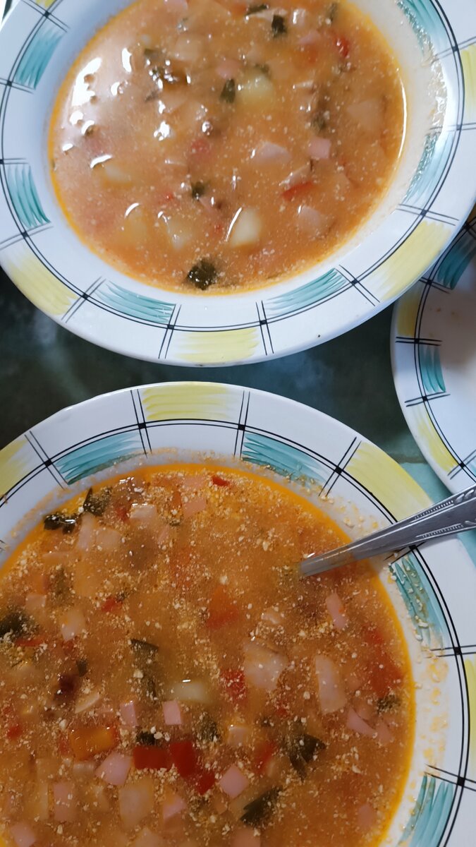 К обеду муж уехал по своим делам, а я сподобилась одной рукой сварить супчик. Хоть сварить это громкой сказано. С ужина оставалась отварная картошка (почему-то лук и картошку вообще у меня не получается чистить одной рукой), а я договорилась сама с собой максимально не тревожить руку, ей и так достается во время поездок по работе. Нарезала колбасок, картошку, из морозилки достала замороженные овощи и зелень, добавила томатного сока и получилось что-то типа ленивой суп-солянки.