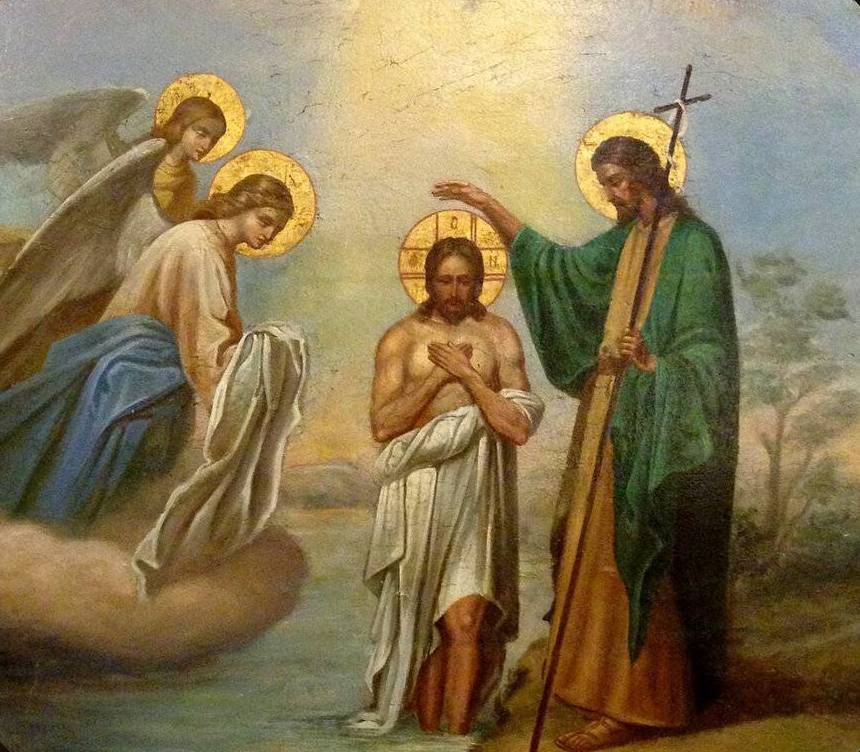 Согласно Евангелию, Иоанн Креститель крестил в водах Иордана приходивших к нему грешников, когда увидел идущего по берегу Иисуса: Тогда приходит Иисус из Галилеи на Иордан к Иоанну – креститься от него. Иоанн же удерживал Его и говорил: мне надобно креститься от Тебя и Ты ли приходишь ко мне? Но Иисус сказал ему в ответ: оставь теперь; ибо так надлежит нам исполнить всякую правду. Тогда Иоанн допускает Его. И, крестившись, Иисус тотчас вышел из воды – и се отверзлись Ему небеса, и увидел Иоанн Духа Божия, Который сходил, как голубь, и ниспускался на Него. И се глас с небес глаголющий: Сей есть Сын Мой Возлюбленный, в Котором Мое благоволение (Мф. 3:13–17).