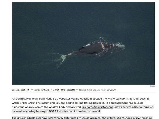 В последние годы мировая популяция североатлантических китов была уничтожена в результате их столкновения с судами и запутывании веревок и сетей. Все это связано с человеком, пишет CNN. По данным отдела рыболовства Национального управления океанических и атмосферных исследований , 4-летняя самка кита, сильно запуталась в сетях у Северной Каролины. Зоологи считают, что она «скорее всего умрет» . Группа аэрофотосъемки из Морского океанариума Клируотер во Флориде заметила кита 8 января, на самке было несколько витков лески вокруг рта и хвоста, за ней еще тянулся маток лесок. Запутывание вызвало многочисленные раны на теле кита и позволило крошечным паразитическим ракообразным, известным как китовые вши, размножаться на ее голове. Биологи говорят, что кит «вероятно умрет. Ученые из океанариума Новой Англии, который ведет Североатлантический каталог правых китов, отслеживая идентификацию и историю наблюдений китов, идентифицировали кита как № 4904, дочь взрослой самки по имени Шпиндель (южн