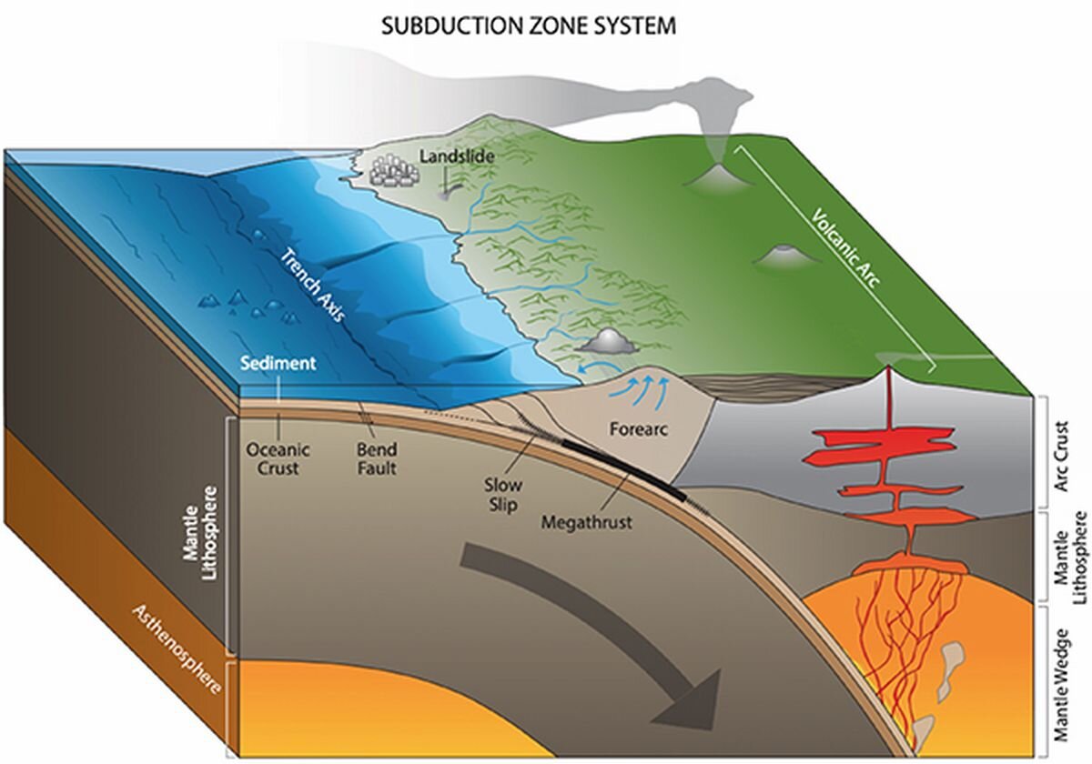 (Результаты: геофизика. «ХиЖ» 2022 №12) Извержения — далеко не единственная опасность, которой подвержен японский регион, принадлежащий так называемому Огненному кольцу. Оно окружает Тихий океан и включает в себя побережья Азии и двух Америк. Здесь иногда буйствуют вулканы, землетрясения, цунами, морские и наземные оползни. Большую часть кольца занимают так называемые зоны субдукции. Так геологи называют те регионы планеты, в основном на побережьях, где сходятся тектонические плиты. В Северной Америке, например, зона субдукции расположена недалеко от береговой линии северо-западного побережья. Основная догма современной геологии утверждает, что в зонах субдукции одна плита подныривает под другую и, медленно скользя и плавясь, опускается в мантию. Зоны знамениты самыми мощными явлениями природы. Считается, что трение плит одна о другую вызывает появление цепей вулканов, землетрясения, образование и взрывы магмы и т. д. Механизм тектоники, абсурдный с точки зрения механики сплошной среды