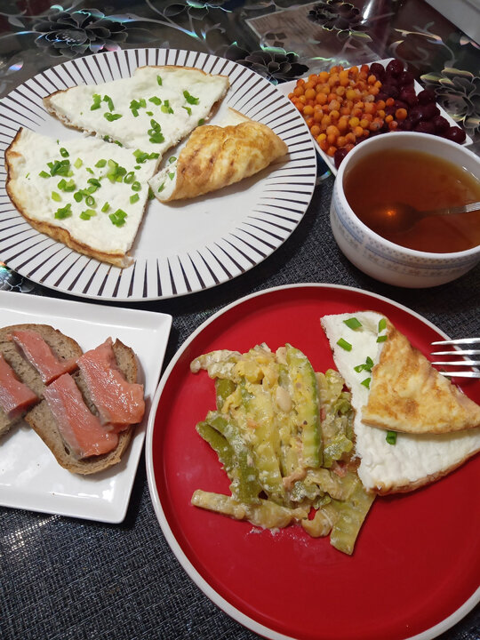 Продолжаю готовить блюда из яичных белков в бутылочках, купленных в магазине. Очень мне они понравились! Сегодня приготовила на сковороде гриль без масла яичницу из белков с творогом и зелёным луком. Получилась белоснежная вкуснота! А ещё вспомнила свое летнее любимое блюдо, и купила 3 штуки свежих кабачков. Нарезала их в длину фигурным ножом на красивые ленточки, слегка потушила в сотейнике на 1 ч.л. оливкового масла, буквально две минутки. Добавила нарезанный ломтиками свежий помидор, зубчик чеснока, соль, черный душистый перчик и 1 ст.л.15% сметаны. Перемешала и под крышкой ещё две минуты, не больше - кабачки очень нежные и быстро готовятся. Ну и мой приготовленный слабосоленый кижуч, два ломтика. Вот влюбилась я в эту рыбку - и за вкус, и за цвет, и за цену! Солила так: На всю рыбку ушло 2 ст.л. соли с горкой. Уложила в контейнер кожей вниз, и ещё добавила немного приправы для рыбы. Вкуснятина! Заварила зелёный чай с ромашкой и достала из морозилки вишню с облепихой. Опускаю ягоды