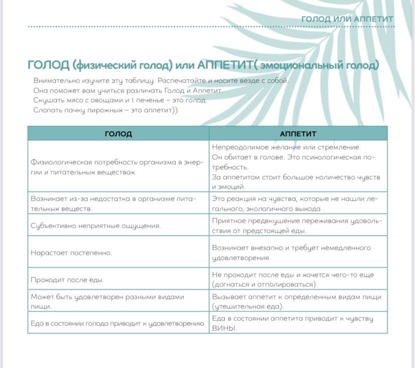 Эта табличка поможет вам, научиться отличать физический (настоящий голод) от эмоционального (который заставляет переедать)