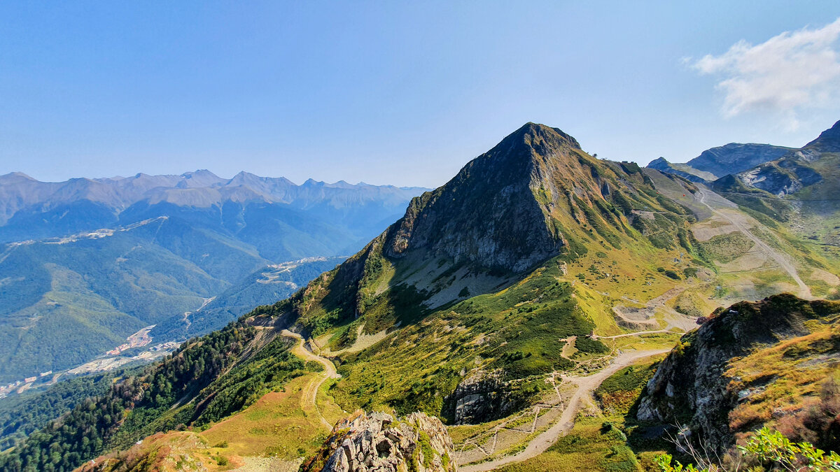 Горнолыжный курорт Роза Хутор в селе Эсто-Садок в летнее время становится прекрасным местом для того, чтобы попробовать себя в горном туризме. Лыжные трассы переоборудуются в пешие тропы различной степени сложности. Можно подняться на подъемнике до начала тропы и пойти по ней, тем самым поняв, как организм реагирует на горный воздух и сильные перепады высот. Примечательно то, что тропы очень хорошо благоустроены, присутствуют указатели и иногда встречаются продуктовые павильоны. Например, когда я поднимался на Ай-Петри в Крыму по тропе, там зачастую было сложно понять, куда дальше идти. Приходилось возвращаться и идти в другом направлении. В Роза Хутор в этом плане намного легче. Фотографии сделаны на горном перевале между станциями канатной дороги Вершина 2200 и Аибга 2050. Координаты: 43.646620, 40.251402