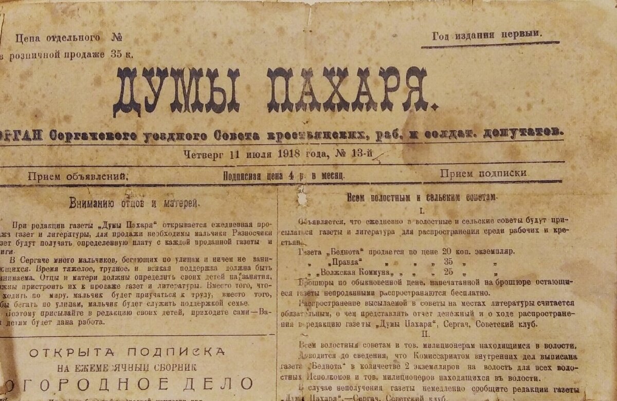 Чтобы расширить и планово проводить постоянную организаторскую и агитационно-массовую работу среди тружеников уезда, по предложению М.И. Санаева, уездный Совет принимает решение об издании новой печатной партийной трибуны – газеты «Думы пахаря». Первый номер этой газеты выходит 22 апреля 1918 года. Газета сыграла большую роль в становлении и укреплении в Сергаче и уезде новой народной власти.