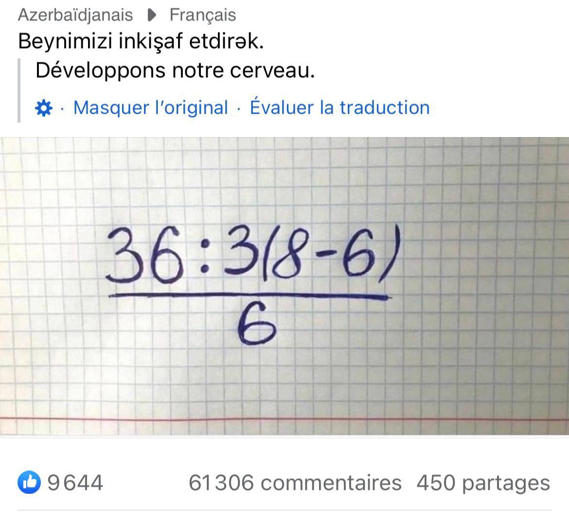В сети завирусился пост со школьным примером по математике, который озадачил десятки тысяч людей. Дело в том, что при его решении люди выбирают разную последовательность действий и приходят к разным результатам: одни утверждают, что правильный ответ «1», другие — «4».