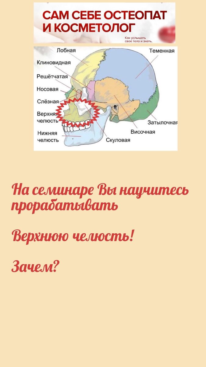 Верхняя челюсть состоит из двух частей. Напряжение в верхней челюсти приводит к ее сужению, к дисгармонии лица, к плохому носовому дыханию, к мешкам под глазами, к носогубным складкам, к морщинам на носу и переносице. Также напряжение в верхней челюсти приводит к напряжению в основании черепа и позвоночнике в целом.