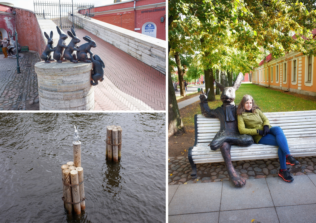Шестой день был последним полноценным днём нашего пребывания в Петербурге. И его мы решили оставить для похода на Заячий остров. Из названия острова ясно, что зайцев там будет много. Одна из скульптур на входе - зайчата, карабкающиеся на пьедестал, так и хочется помочь им взобраться наверх. И таких скульптур много еще на этом острове. В здания мы не заходили, там вход платный, а вот на территорию крепости можно заходить бесплатно. Мы подсчитали время так, чтобы успеть увидеть как в 12 часов, ровно в полдень будет стрелять сигнальное орудие. Мы смотрели на "пушку" со стороны пляжа. Бахнула так бахнула, аж физически почувствовали звуковую волну. Встретили на пляже "моржа", смелого мужчину, который решил искупаться в Неве, несмотря на холод. Хоть и был этот день, на удивление, солнечным, но всё же руки мерзли даже в перчатках. Затем мы сходили в монетный двор и приобрели себе на память несколько монет, одна из которых теперь украшает наш холодильник. Хотелось бы добавить несколько факто