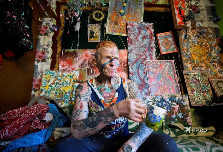 - Кто этот мощный старик? – задаются вопросом люди, которые впервые видят татуированного пенсионера. Фотографии полностью «забитого» картинками дедушки разлетелись по всему интернету. Эпатажный мужчина это Владимир Седаков из Екатеринбурга, но все его знают, как Владимира Спартака. В городе он настоящая звезда – художник, поэт, писатель, дизайнер одежды. Сам он считает себя гением, а люди думают, что он сумасшедший. «Комсомолка» съездила в гости к Спартаку и посмотрела, как он живет. «Я ЧЕЛОВЕК ИСКУССТВА» Дом Спартака заметно отличается от всех остальных: островок частного сектора Екатеринбурга среди свежих высоток. Но этот покосившийся одноэтажный терем видно издалека. «Хлеб патриотизм разума», «Жизнь подвиг сердца» - кричат надписи на фасаде голубого домика. Остальные стены также разрисованы красками и лозунгами. Заходим в дом, где нас встречает хозяин со шваброй в руках. - Не успел помыть полы, - хихикает пожилой мужчина в порванной майке с рыжим ирокезом, ловко прыгая от ведра к ка