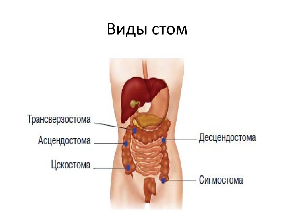 Клинически, в зависимости от различных поражений и мест хирургического вмешательства, стому можно разделить на виды: 1. Колостома На 1-1,5 см выше брюшной стенки и диаметром около 3-5 см колостомия обычно располагается в левом подчревье и представляет собой постоянную стому для ободочной или сигмовидной кишки. Выделенный отсюда кал обычно имеет форму. 2. Илестома На 1,5-2,5 см выше брюшной стенки и диаметром около 2-2,5 см илеостома обычно располагается в правом подреберье и является отверстием дистального отдела подвздошной кишки в брюшной стенке. Фекалии, выделяемые герой, обычно жидкие и богаты пищеварительными ферментами, вызывающими сильное раздражение окружающей кожи. 3. Временная стома Стома располагается в сегменте тронс-ободочной кишки, то есть в эпигастрии, и представляет собой двухствольную или лооρ-стому большого вида. Проксимальная стома выделяет жидкий стул, тогда как дистальная стома выделяет лишь небольшое количество кишечной слизи. Томпорная стома играет роль шунтирую