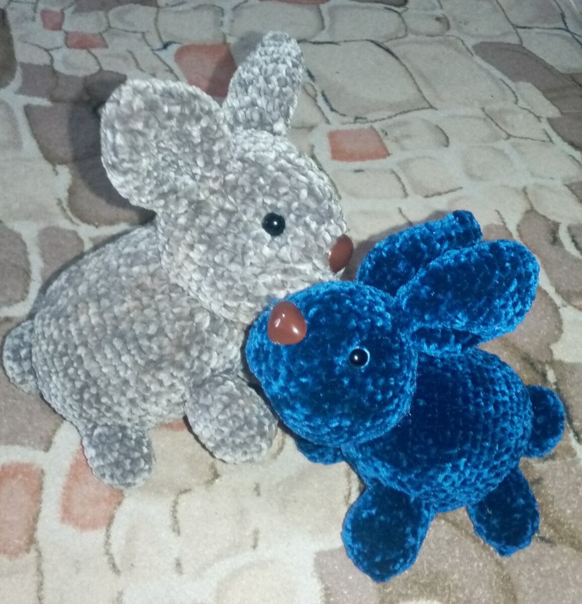 Милый кролик крючком. Добрый день, дорогие друзья, я рада приветствовать всех, заглянувших на мой канал. Сегодня мы вместе с вами свяжем вот такого милаху кролика крючком. Нам понадобится: Моточек плюшевой пряжи. Крючок необходимого размера. (у меня троечка) Нитки для сшивания Глазки и носик (к стати носик можно вышить, тогда пригодятся нитки для вышивки) Наполнитель. Ножницы. И так, приступим: 1Голова. 6сбн, в кольцо амигуруми. 1р. 6 прибавок (12сбн) 2р. (1сбн, прибавка)х6 (18сбн) 3р. (2сбн, прибавка)х6 (24сбн) 4р. (3сбн, прибавка)х6 (30сбн) 5-11р. (7рядов) -30сбн Если глазки на безопасном креплении, то вставить глазки межу 8и9 рядами, расстояние между глазками 9 столбиков. 12р. (3сбн, убавка)х6 (24сбн) 13р. (2сбн, убавка)х6 (18сбн) На данном этапе голову набить наполнителем, но не плотно, т.к. будут утяжки. 14р.(1сбн, убавка)х6 (12сбн) 15р. 6 убавок (6сбн) Нить обрезать, при необходимости добавить наполнитель, отверстие стянуть. Голова готова 3. Туловище. 6сбн, в кольцо амигуруми. 1