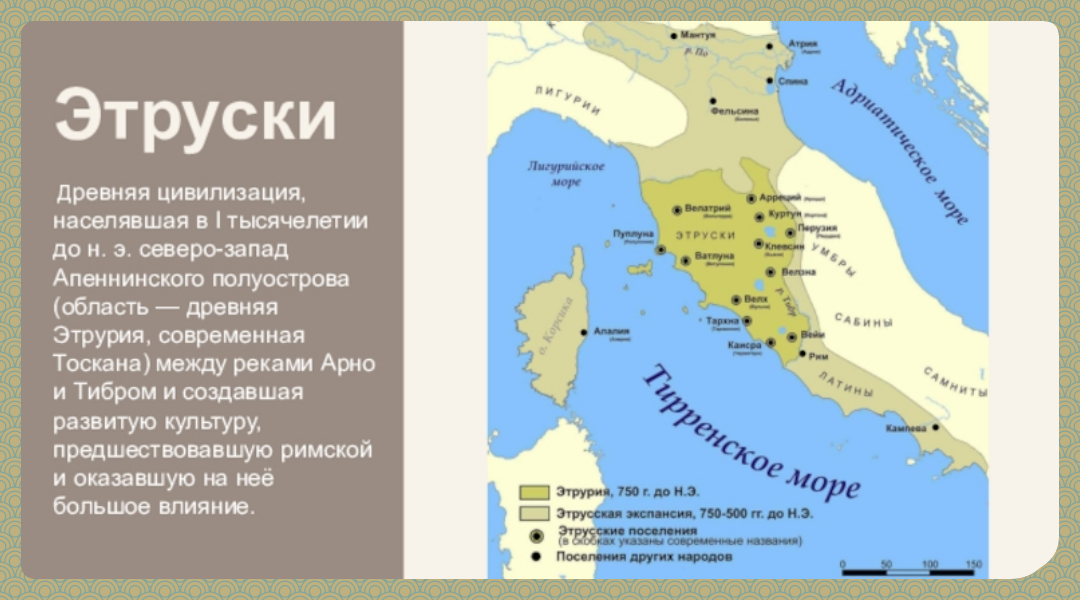 Эта цивилизация имела высочайшую степень развития, как в технологиях, так и в искусстве, которую по истечении многих веков переняли древние римляне. Древняя Этрурия раскинулась на землях нынешней Тосканы и Лацио, представляя собой отдельные автономные поселения, которые имели общие языковые корни и культурные традиции