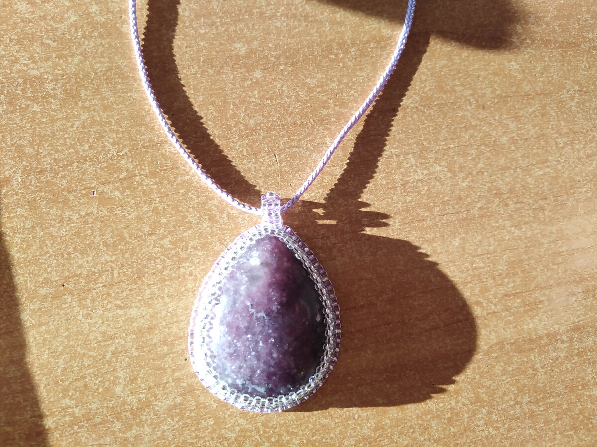 На Новый Год я делала платье принцессы Софии. Скоро я про него расскажу, а пока расскажу про кулон, сделанный в комплект к платью. В мультфильме он называется амулетом, но я его буду называть кулоном. По этому способу можно сделать и другие подобные украшения. Итак, нам понадобятся: Для начала приклеим камень на плотный фетр. Затем берем серебристый бисер и начинаем обшивать камень. В каждую вторую бисеринку после пришивания вдеваем нитку и затем пришиваем следующую. Таким образом у нас часть бусин будет очень прочно держаться, а половина нет. Затем делаем второй слой, захватывая выступающие бисеринки первого слоя. Таким образом получается как бы стенка из бисера. Затем делаем третий ярус, захватывая выступающие бисеринки второго. А теперь проходим ниткой через выступающие бусинки, чтобы затянуть верхний слой. Теперь приклеиваем кожу на внутреннюю сторону и обшиваем бусинками по краю. Вдеваем веревочку, делаем застежку, и... готово! Удачи в творчестве!