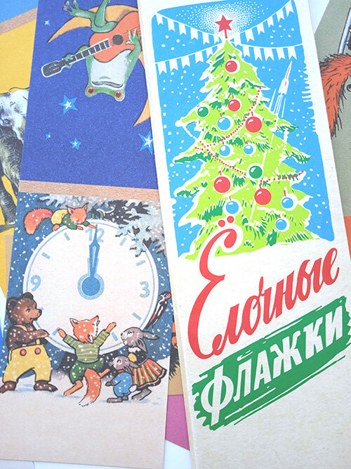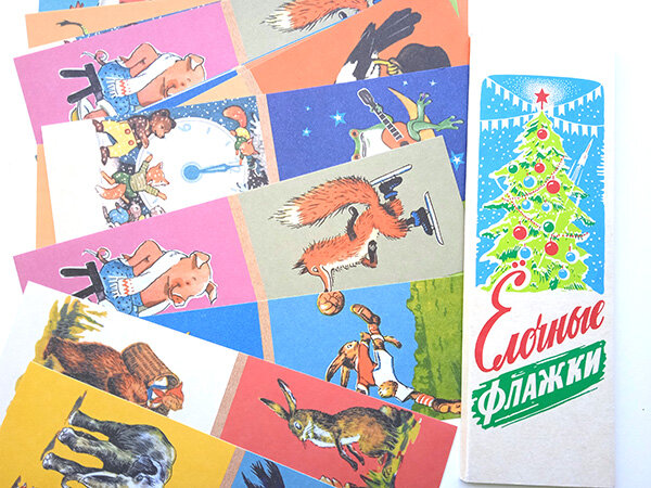 Честно говоря, хотела уже сворачивать тему Нового года до осенних публикаций, но желание показать свою маленькую, но симпатичную покупку одержало верх. Накануне Нового года у нас в Перми проходила книжная выставка-ярмарка, на которой мы купили набор бумажных ёлочных флажков, изданных в ретро-стиле. Точнее, картинки повторены из советских наборов. Набор выпущен издательством "Сталинский букварь", которое переиздает ещё и советские учебники, тетради, дневники... В общем, богатство для любителей ретро. Хотя мне ближе всё-таки оригиналы учебников и прописей - пусть потрёпанные и мятые, но изданные в прошлом веке. Поэтому ограничилась покупкой только флажков - уж очень картинки меня приманили. Честно: не очень глубоко искала, кто художник рисунков, поэтому вдруг кто-то из читателей знает автора картинок - пишите в комментариях. Потому что современное издательство на обложке авторов не указало. В набор входит 10 листов + еще 10 повторяющихся. На каждом листе по две картинки: если согнуть, п