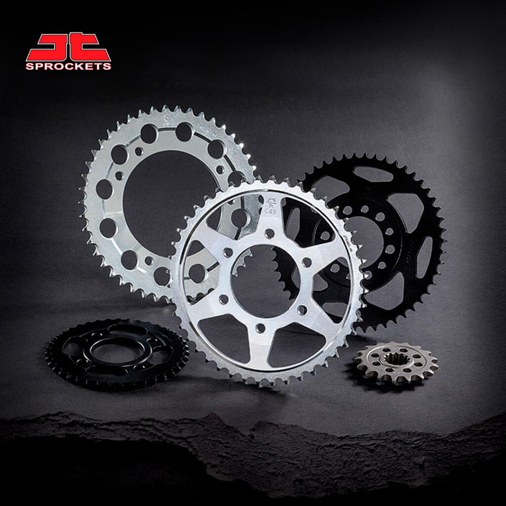 Передние звёзды JT Обычные стальные звёзды, естественно, в модельном ряду есть. Обозначаются они как JTF и цифры после этой аббревиатуры. Их или вырезают лазером из стального проката, или отливают, если в разрезе звезда не плоская. Маркируются они так: JT – бренд, F – front (передняя), цифрами далее обозначается тип звезды, две цифры после тире – количество зубьев на ней. Такие звёзды делаются из износостойкой хром-молибденовой твёрдой стали марки SCM420 и окрашены прозрачным лаком для сопротивления коррозии. Для дорожных мотоциклов есть передние звёзды с резиновым демпфером, снижающим уровень шума в движении и делающим работу цепного привода тише и плавнее. На эти выступающие из боковин звезды резиновые кольца опираются пластины цепи, мягче без удара ложась на зубья. Это простое решение не только снижает шум, но и увеличивает ресурс цепи. Звёзды JT с резиновым демпфером маркируются буквами RB в конце (RubBer - резина). Для внедорожных мотоциклов тоже есть свои звезды. Они отличаются н