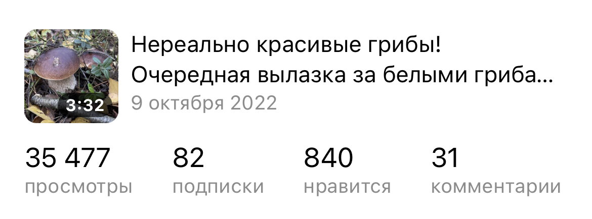 Хочу подвести свои итоги за три месяца его существования канала. Если честно, то таких показателей я никак не могла ожидать и конечно, очень рада, что все так получилось. Почти 100 подписчиков! Это так здорово, спасибо вам большое, что подписываетесь, ставите лайки и комментируете. Очень люблю читать ваши комментарии, это сильно поднимает настроение! Постов у меня немного, но за этот период мне удалось понять, что очень многим интересна тема грибов. Так же как и мне, я сама люблю смотреть видео и читать посты про походы за грибами. И большинство аудитории пришло именно с моего видео, которое собрало такие показатели И я уже очень жду лета и лесных прогулок, чтобы поскорее наслаждаться поездками, солнышком и грибным уловом, и конечно, делиться этим с вами 😊 Для меня конечно это просто космические цифры и тааак приятно это видеть 🤩 Так же как количество лайков и комментариев Еще раз спасибо за вашу активность! Оставайтесь со мной, впереди будет много интересного ❤️