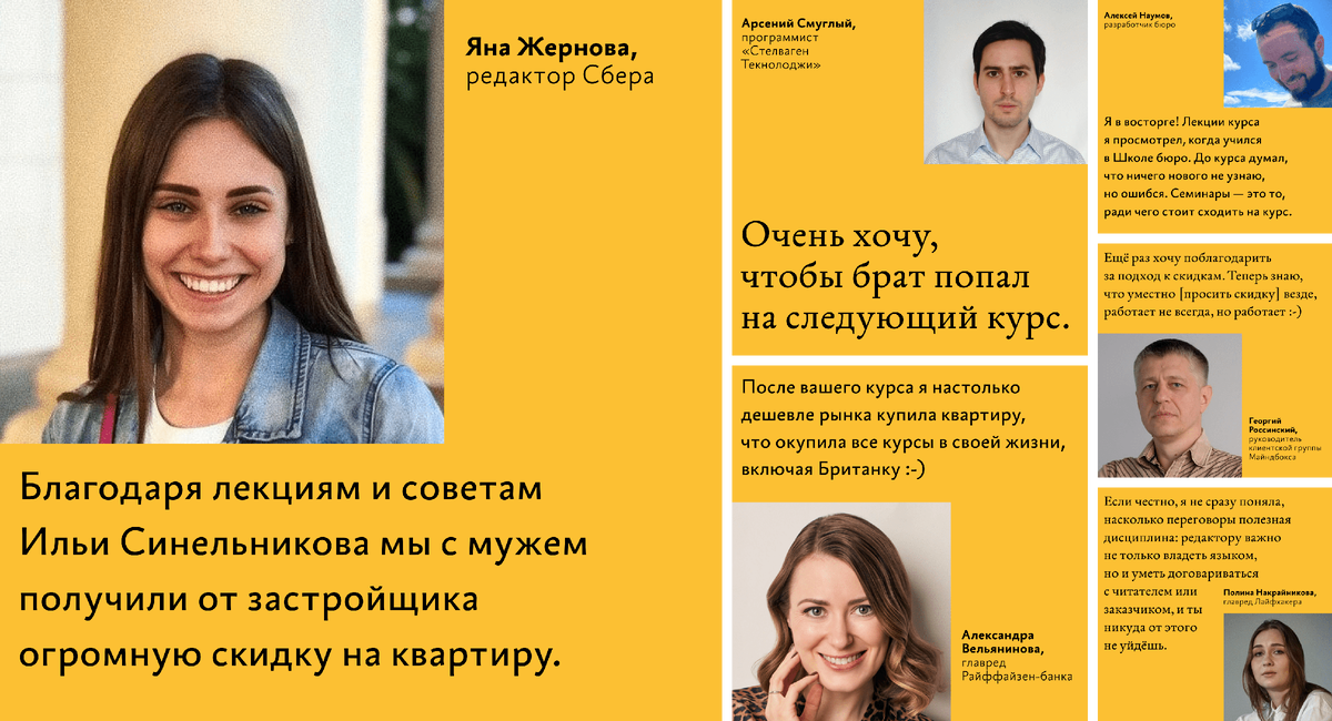 На странице дистанционного курса Ильи Синельникова «Переговоры и отношения с клиентами» опубликовано 7 новых отзывов. Ближайший курс пройдёт в дистанционном формате 27 февраля — 25 марта. До субботы 28 января стоимость ниже на 30%, позднее — участие станет дороже. Успейте записаться! На курсе рассматриваются универсальные приёмы устных и письменных переговоров. Подробно разбираются отношения с клиентом в развитии: от первого обращения и понимания задачи до работы в проекте и профилактики ссоры. Почти всё время с преподавателем посвящено практическим занятиям, а теория подготовлена для самостоятельного изучения. Прочтите отзывы, если сомневаетесь, стоит ли идти на курс. Мы публикуем все отклики, даже негативные. Кстати, если вы написали отзыв, но его нет на странице курса — пришлите нам, мы опубликуем: courses@bureau.ru Записаться на дистанционный курс 27 февраля — 25 марта