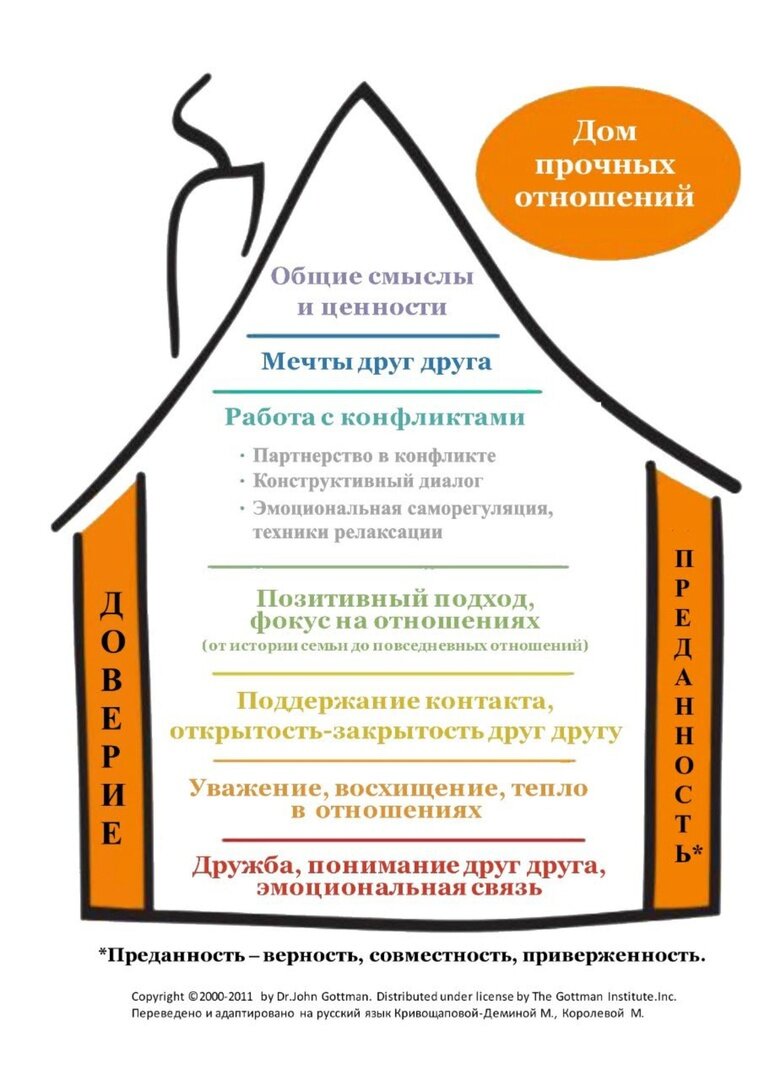 Что же такое, « Дом прочных отношений»? Это когда мужчина и женщина, решили стать парой и создать крепкую семью. На начальном этапе, когда сильны эмоции и чувство влюбленности, молодым кажется, что все легко и просто. Многие особенности и разница взглядов не учитывается, партнер кажется идеальным. А когда начинается семейная жизнь, и появляются конфликты, дом начинает трескаться… И если он прочный, то ему не страшны ни какие преграды и он простоит всю жизнь! Как же его построить, « Дом прочных отношений»? Этот дом, как и любой другой, состоит из фундамента, стен, этажей и крыши. Разберем все по порядку; 1. Фундамент. Это начальный этап отношений. Дружба, понимание, эмоциональная связь, интерес, уважение. Часто пара обращается, когда уже нет интереса друг к другу, пропало уважение и банальное общение, тогда начинаем укреплять фундамент. Если тут все ок, движемся дальше. 2. Стены. Доверие и преданность. Доверие, знание, что партнер будет действовать не только из своих личных интересов, н