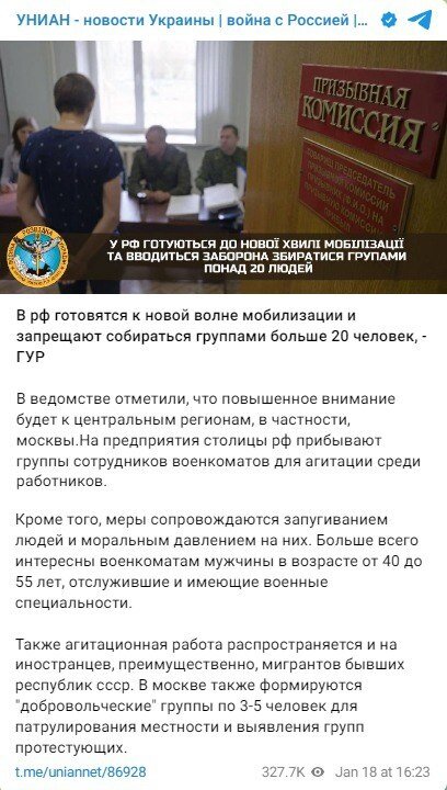 Что проверяем Правда, что в России готовятся к новой мобилизации и поэтому запрещают собираться в группы более 20 человек? С чего все началось В России готовятся к новой волне мобилизации. Якобы поэтому россиянам запрещают собираться в группы более 20 человек. А Москве формируют «добровольческие» группы по 3-5 человек, для патрулирования местности и выявления протестующих. Такие сообщения распространяют украинские каналы и группы в соцсетях и мессенджерах. Как на самом деле На самом деле, в России не готовятся к «новой волне» мобилизации, а массовые мероприятия никто не запрещал. В этом легко убедиться — достаточно купить билет на концерт, спортивный матч, в кино или театр. Что касается добровольческих групп, то их формируют не в Москве, а в приграничных с Украиной регионах. Например, в Курской области народные дружины патрулируют районы, граничащие с Украиной. Председатель комитета региональной безопасности Курской области Михаил Горбунов сообщил, что вместе с МВД сформировали 98 друж