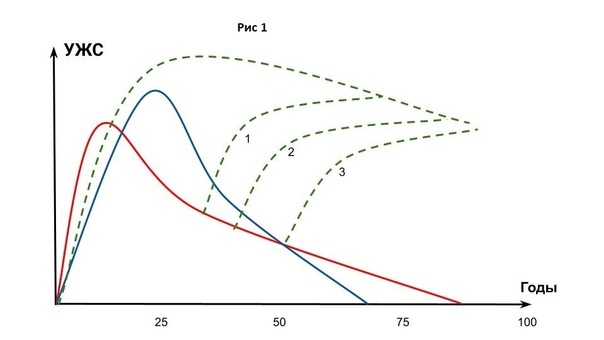 Я более 20 лет работал в науке и мне проще показать это на простых графиках. Рис 1. Синяя кривая показывает закономерности изменения УЖС (уровня жизненных сил) приблизительно 50 лет назад. Человек рос и развивался в среднем до 25 лет, а потом УЖС начинал падать и средний срок продолжительности жизни был около 65 лет.