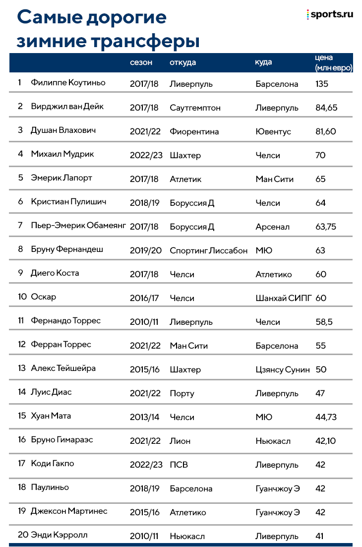 В самом разгаре зимнее трансферное окно, и я решил вспомнить самые дорогие зимние трансферы в футболе. 15 января «Челси» объявил о трансфере Михаила Мудрика. Контракт до 2031-го, но внимание привлекла цена – за вингера заплатят 70+30 млн евро, а сам футболист будет зарабатывать 7,5 млн евро в год. А вот как выглядит список самых дорогих зимних трансферов. • Больше всего футболистов ушли в АПЛ – 11 из 20. Потратились пять клубов: «Ливерпуль», «Челси», «Ман Сити», «МЮ» и «Ньюкасл». В остальных европейских лигах команд поменьше: в Испании «Барселона» и «Атлетико», из Италии лишь «Ювентус». Ни одного немецкого и французского клуба в числе покупателей. А вот среди продающих география шире: добавляются «Саутгемптон», «Фиорентина» и «Атлетик», кроме топ-5 чемпионатов есть два трансфера из Украины (Мудрик и Алекс Тейшейра из «Шахтера»), столько же из Португалии (Бруну Фернандеш из «Спортинга» и Луис Диас из «Порту»), Коди Гакпо помог войти в список нидерландскому ПСВ. • 5 из 20 переходов слу