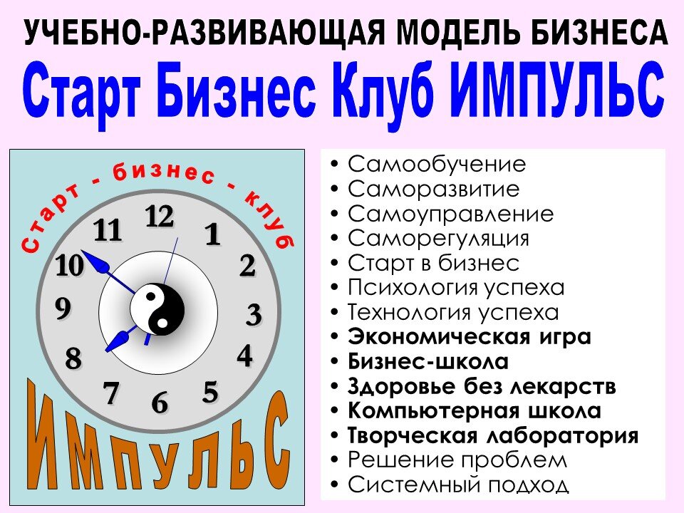 В Старт Бизнес Клубе ИМПУЛЬС предлагаются образовательные услуги и информационные продукты по следующим направлениям: