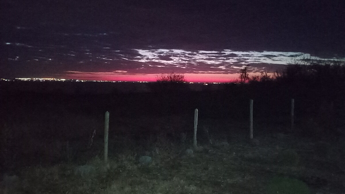 Сегодня удивительный восход. Теперь понятно, почему сумрак розовый. Прямо на глазах небо меняет света. Похоже на замедленное северное сияние.