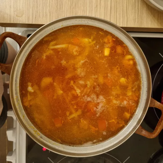 Лёгкий, вкусный, ароматный, обязательно попробуйте приготовить! Ингредиенты Курица 3000г Картофель 600г Капуста 300г Помидоры 60г Шаг 1 Поставьте мясо вариться, капусту нашинкуйте, почистите картофель и нарежьте кубиком Шаг 2 Мясо вытащите и поставьте остужаться. Картофель и капусту добавить в бульон. Варить минут 15. Шаг 3 Морковь натрите на тёрке. Помидор нарежьте как можно мельче. Обжарить все на растительном масле. Добавить томатную пасту. Шаг 4 Добавить в суп зажарку и общипать курочку. Варить пару минут, готово! Приятного аппетита