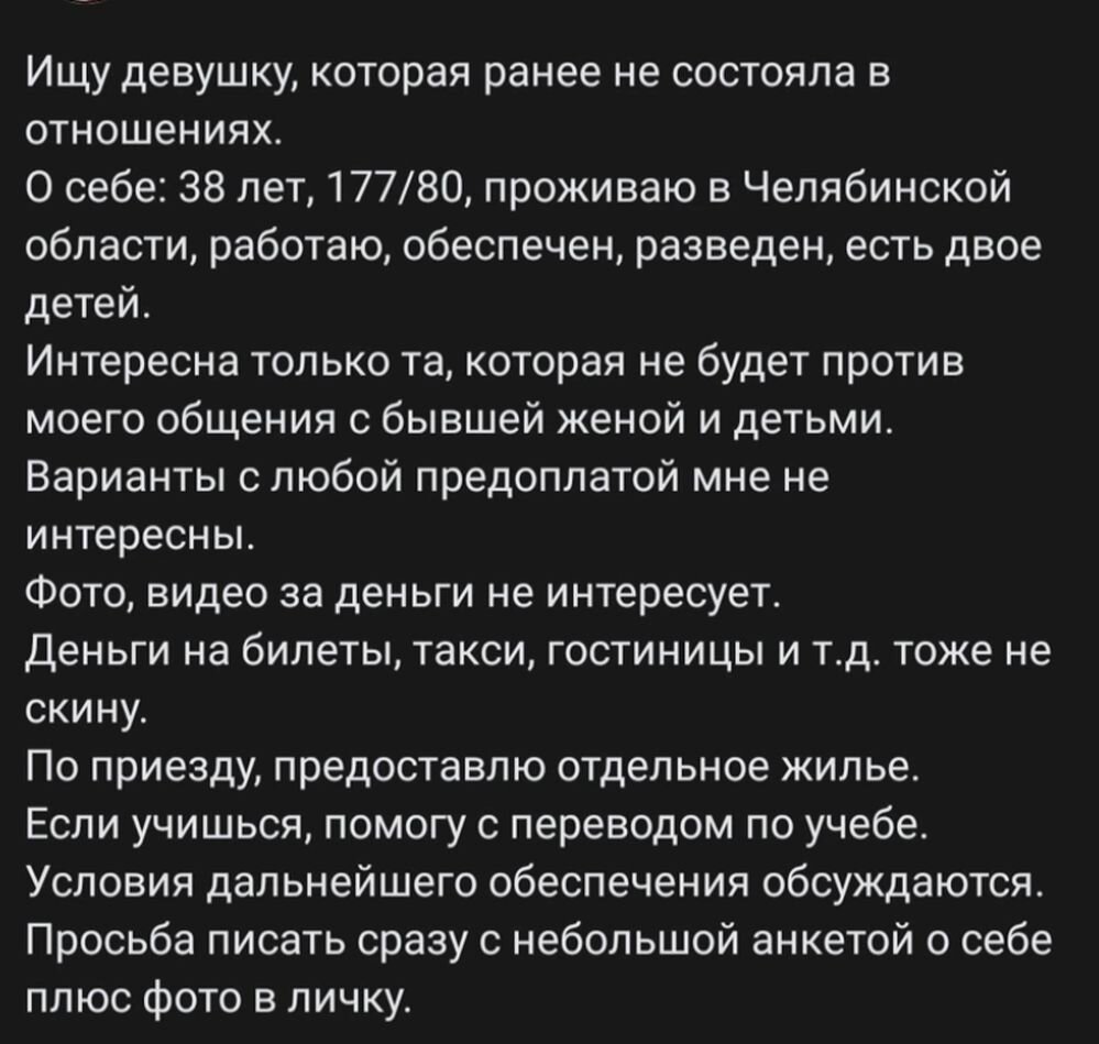 Всем привет! Я буквально недавно уже писала о неадекватном мужчине, который в 44 ищет 30-летнюю. Нате вам еще одного. Он круче;) Идем по пунктам. Мой вердикт: на этого субъекта может позариться только малолетка из глухой деревни, не видевшая в жизни ничего, кроме постылой помятой физиономии пьяного бати. Или же меркантильная дурочка-студентка из такой же тмутаракани, рассчитывающая на выгоду. Только вот с бывшей и детьми от бывшей, от которых мужичок никак не хочет отпочковываться, вряд ли озолотиться получится. Стратегия заранее проигрышная. Пойду от тошноты что-то выпью. Всем пока;)