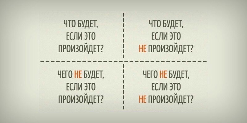Кроме того, стандартное мышление человека способствует тому, что он задаёт себе всего лишь один вопрос: «Что будет, если это произойдёт?», ведь обычный сценарий поведения подразумевает выполнение какого-либо действия и оценку последующей за ним обратной связи. Но на практике уже было сотни раз доказано, что в первую очередь необходимо сначала основательно подумать и только после этого выполнять действие.