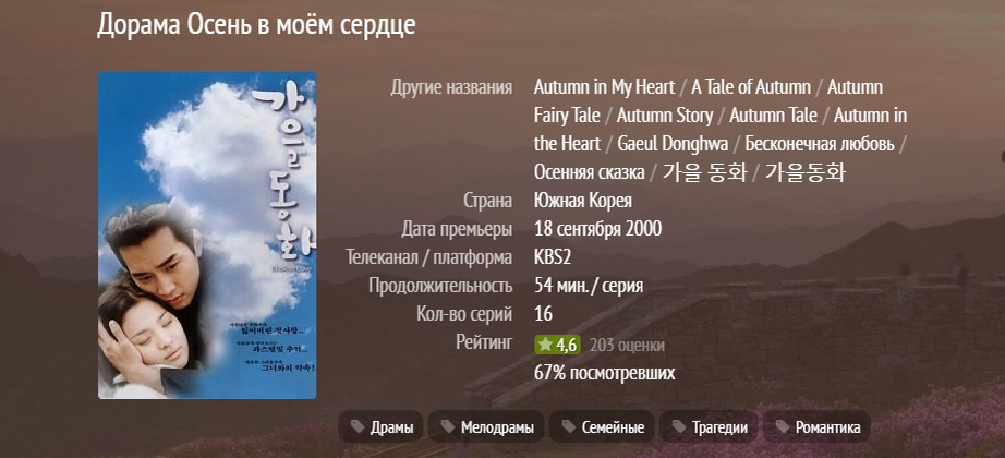 Испытывая особую нежность к стареньким дорамкам, решила посмотреть давно отложенную к просмотру "Осень в моём сердце". Как оказалось, это самая старая из всех, какие я на данный момент посмотрела - 2000-ого года!