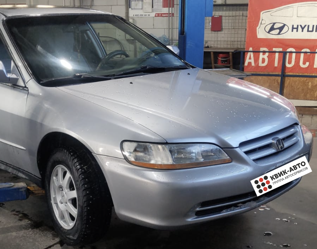 Автомобиль Honda Accord в кузове CG5 2002 года выпуска с пробегом около 200 000 км. Данный авто был доставлен в наш автосервис на эвакуаторе, так как, со слов клиента, при проезде искусственной неровности послышался удар со стороны переднего правого колеса, автомобиль наклонился в эту же сторону и далее уже не мог перемещаться самостоятельно. При проведении визуального осмотра нашим специалистом было отмечено нетипичное положение переднего правого колеса, а также повреждение переднего правого крыла. Все это, а также нарушение целостности внутреннего шарнира равных угловых скоростей, является следствием разрушения передней нижней шаровой опоры. Конструктивные особенности этой детали ходовой части таковы, что при износе полимерного вкладыша вполне привычные нагрузки могут привести к выходу металлического стержня (так называемого пальца) из цилиндрического корпуса. Обычно, износ полимерного вкладыша происходит постепенно в течении довольно длительного времени, поэтому при проведении регул