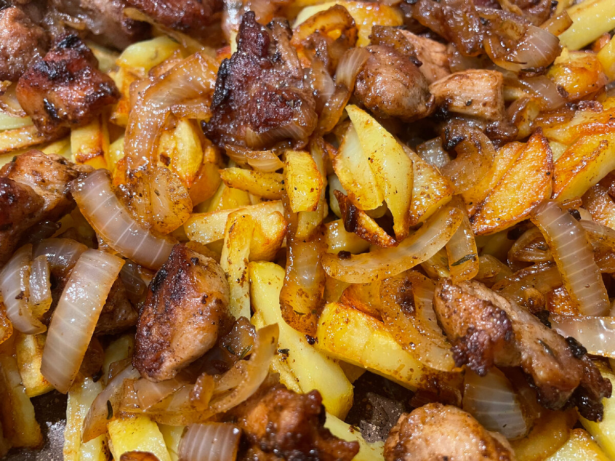 Это наверное больше, как вариант, чем рецепт, но все же! Надеюсь, буду полезна и кто-то точно захочет так же👍🏻 Нужно: Порежь свинину (лопатку, окорок или шею) небольшими кусками и обжарь на сковороде. У меня была шея порезана на маленькие кусочки, ждала в морозилке своего часа. Специи люблю кидать в момент жарки. Порежь лук на 1/4 кольца. Закинь лук к мясу и обжарь все вместе. Картофель почисти, помой и порежь палочками. Начинай жарить в чистой сковороде. Я жарю так: закинула - через 4-5 минут перемешала широкой лопаткой - снова 4-5 минут и мешать - ещё 4-5 минут - мешаю и накрываю крышкой убавив огонь - через 5 минут открываю, придаю огня, солю сверху - перемешиваю каждые 2 минуты, пока снова не захрустит. Это не правила жарки картошки, а просто мой способ, возможно, не только мой 🙈 К такой красивой картошечке добавляем наше мясо, немного размешиваем и выключаем. Готово! Приятного аппетита! Спасибо за ваши лайки и дочитывания! Я радуюсь, как ребенок, своим новым подписчикам!