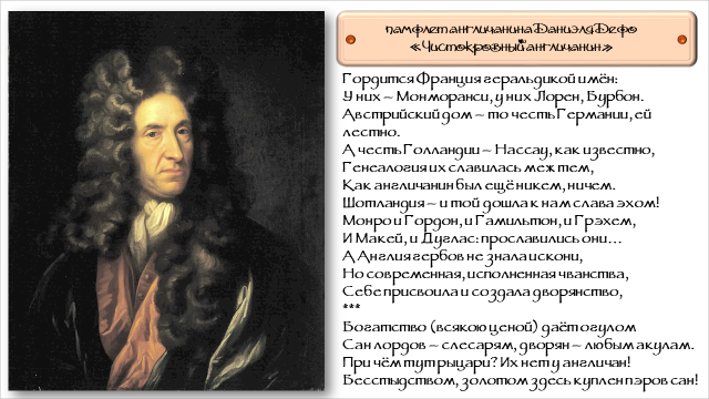 Даниель Дефо (имя при рождении Даниель Фо; около 1660, район Криплгейт, Лондон — 24 апреля 1731, район Сприндфел, Лондон) — английский писатель и публицист. Известен главным образом как автор романа «Робинзон Крузо». Дефо — плодовитый и разнообразный писатель, он написал более 500 книг, памфлетов и журналов на разные темы (политика, экономика, криминал, религия, брак, психология, сверхъестественное и др.). Он был также основоположником экономической журналистики. В публицистике пропагандировал здравомыслие, выступал в защиту веротерпимости и свободы слова. За один из его острых памфлетов суд приговорил его к штрафу, троекратному стоянию у позорного столба, внесению залога, призванного обеспечить его надлежащее поведение, и тюремному заключению на срок, зависящий от милости королевы.