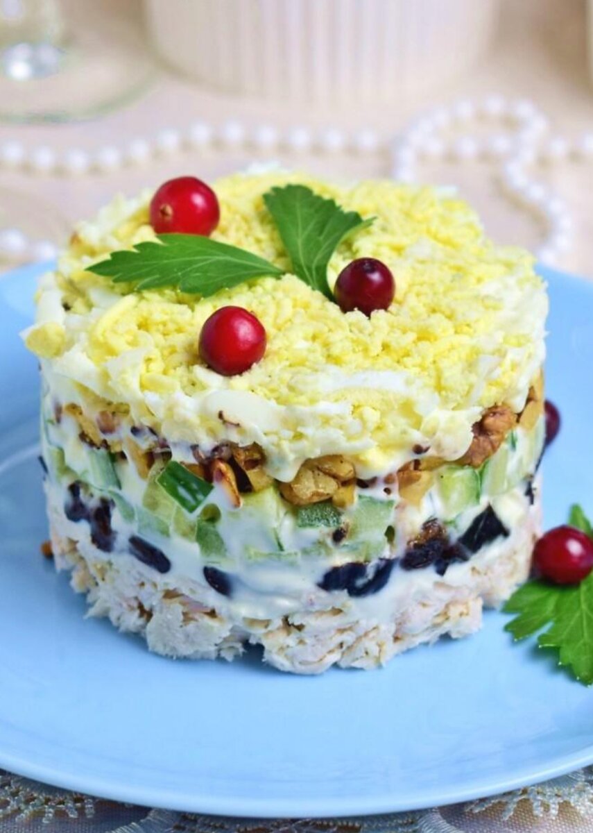 Как сделать слоёный салат Нежность с курицей, черносливом, грецкими орехами и огурцом? Подготовьте для этого необходимые ингредиенты по списку. Куриное филе и яйца заранее отварите и остудите. Куриное мясо для салата опустите в кипящую воду и проварите минут 30, в слегка подсолённой воде. Яйца отварите в кипящей воде в течение 7-8 минут. Затем горячую воду слейте и охладите их в холодной воде. Свежий огурец промойте в проточной воде от загрязнений. Чернослив залейте кипятком и дайте ему постоять 5 минут. Затем горячую воду слейте и чернослив промойте еще раз в холодной воде. Обсушите чернослив бумажным полотенцем, чтобы удалить с него излишки влаги. Пропаренный чернослив нарежьте на маленькие кусочки. Грецкие орехи порубите ножом и обжарьте на сухой сковороде несколько минут, до появления характерного аромата. Затем пересыпьте их на тарелку, чтобы на горячей сковороде они не подгорели. Салат можно выложить слоями в общий салатник или сделать порционно. Первым слоем салата выложите мел