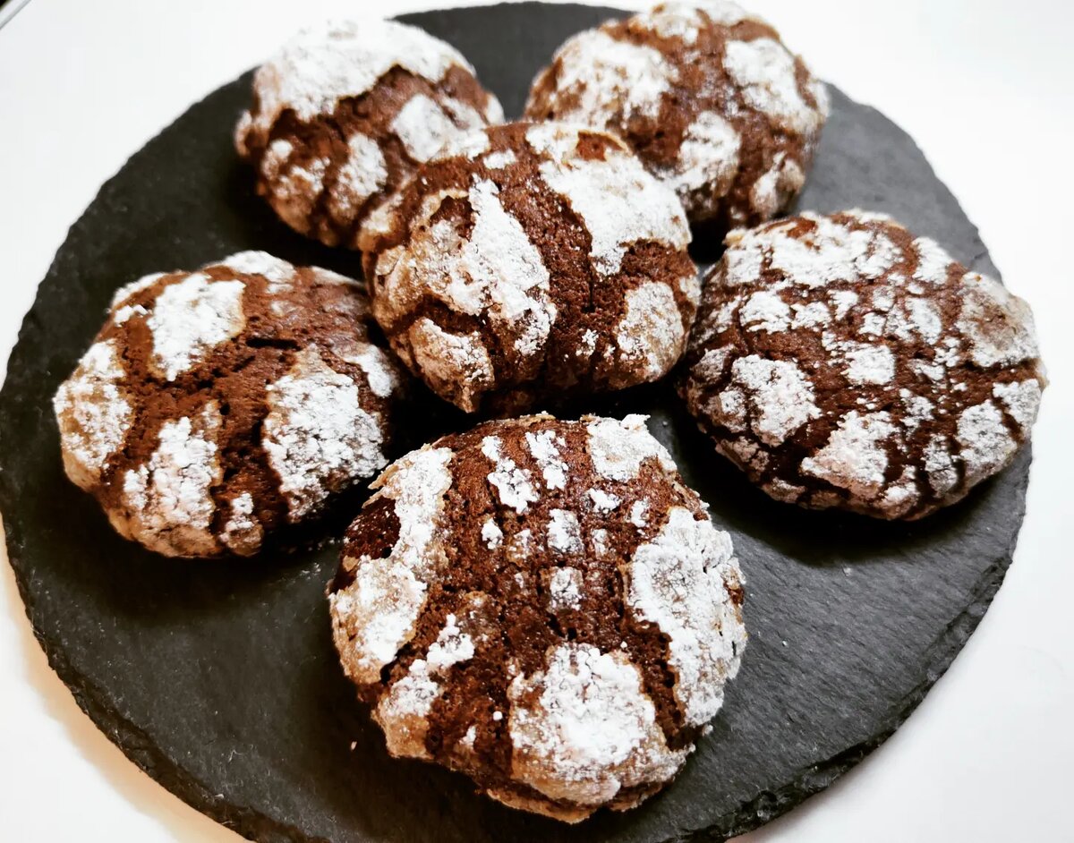 На 1 противень нам понадобится: - яйца 3 шт. - сахар 130 гр. - мука 130 гр. - какао-порошок без сахара 60 гр. - масло растительное рафинированное 50 гр. - кофе растворимый 1 ч.ложка - разрыхлитель 1 ч.ложка - соль на кончике ножа - сахарная пудра примерно 1/2 стакана Готовим: В миску высыпаем сахар, какао-порошок, кофе и соль: Вливаем растительное масло: Разбиваем туда же яйца: Взбиваем миксером примерно 1 минуту (до однородной массы): Муку смешиваем с разрыхлителем и в пару приёмов всыпаем в тесто, продолжая взбивать до однородности. Тесто получается как густой шоколадный крем 😊: Собираем его со стенок миски лопаткой, прикрываем плёнкой и ставим на холод на 20 минут: Тем временем готовим противень - застилаем его бумагой для выпечки. В глубокую тарелку насыпаем сахарную пудру. Духовку включаем на 180 градусов. Пальцы смачиваем водой, отрываем кусочек теста и скатываем шарик размером чуть побольше грецкого ореха. Обваливаем в сахарной пудры и выкладываем на противень