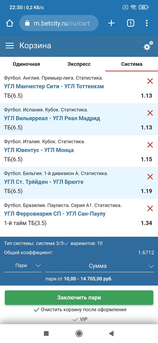 Для этого нужно собрать 5 матчей которые много пробивают угловых и сегодня они как раз есть на фото скрене я их собрал. Приоритеты на Букмекера Бетсити там есть возможность собирать такие экспрессы в системник. Если хотябы 3 матча пройдут системник пройдет с кефом 1.60 Хорошие системники проходят с большим % вероятности.