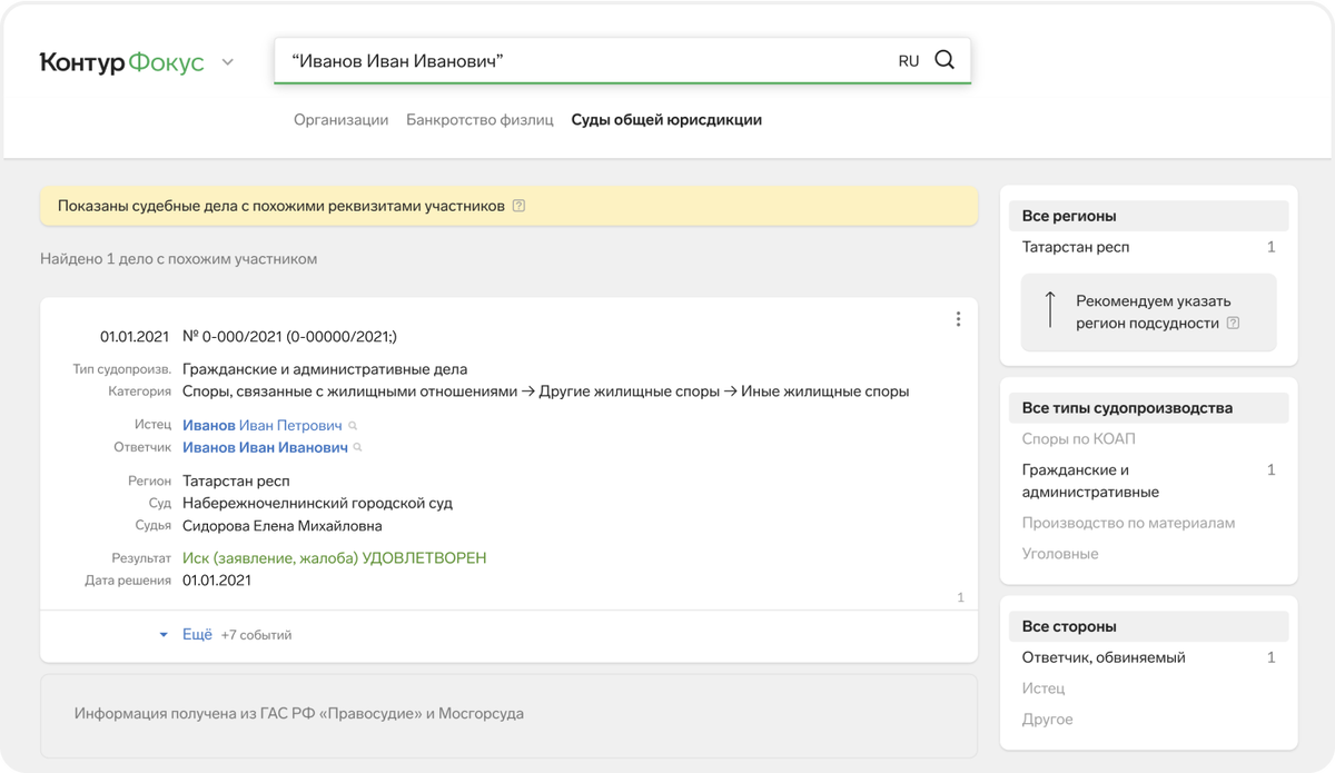 Сейчас в Контур.Фокусе находится более 100 миллионов дел за период с 2005 по 2023 год. Данные собираются из официальных источников и обновляются каждый месяц. Чтобы узнать, является ли человек фигурантом дела, нужно ввести его ФИО в кавычках в поисковой строке сервиса и перейти во вкладку «Суды общей юрисдикции». Для более точного результата поиска, можно использовать фильтры: по региону, типу судопроизводства и стороне дела. Фокус не показывает персональные данные физлиц, кроме их ФИО. Поэтому есть вероятность, что вы увидите судебные дела не искомого человека, а полного его тезки. Сведения не могут быть прямым доказательством участия человека в судебном деле, но могут стать сигналом для дополнительной проверки. Василий Прокопьев