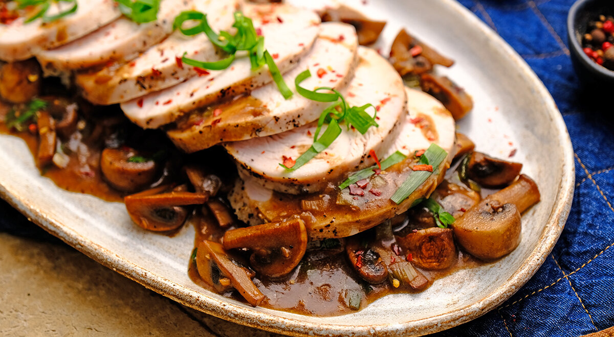 Ингредиенты: 700 г филе грудки индейки 250 г шампиньонов 5 ст. л. соевого соуса 2 зубчика чеснока 3 см корня имбиря 3 стебля зеленого лука 1 ст. л. кукурузного крахмала 3 ст. л. растительного масла соль свежемолотый черный перец 📝 Количество калорий - 350,4 ккал БЖУ: 37,8 г / 18,6 г / 8,8 г Пошаговый рецепт ______ шампиньоны, соевый соус, Здоровое питание, индейка, Мой Магнит