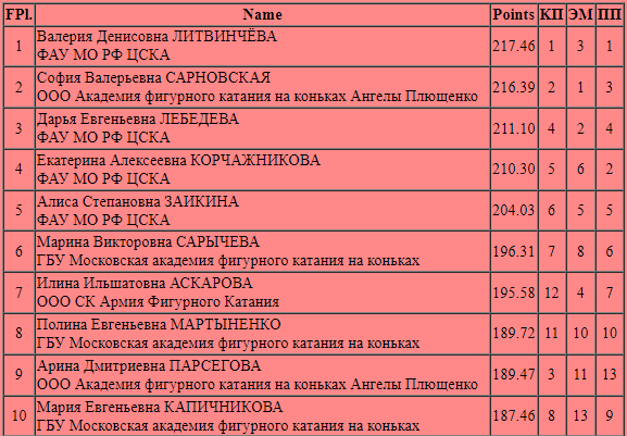 Также падение стало решающим фактором в соперничестве за 6 место, проходное на Первенство России. Илина Аскарова упала в самой концовке программы и оказалась первой запасной на главный старт сезона. Можно поздравить Марину Сарычеву. Это ее первое в карьере Первенство Москвы и сразу такой большой успех.