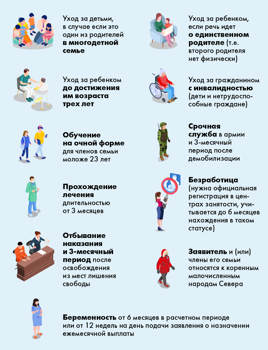 Для получения Единого пособия нужно чтобы родители работали или имели объективную причину не работать. Что это за причины? Сейчас разберем: 1. Беременность. Если Вы были беременны более 6 месяцев за последний год или срок беременности уже 3 месяца на момент подачи заяления. 2. Уход за детьми. Это для многодетных, если вы имеете такой статус, то 1 из родителей может не работать. 3. Уход за ребёнком. Если Вы единственный родитель у ребенка. (второй родитель умер, не указан в свидетельстве о рождении или пропал без вести). 4. Уход за ребёнком до 3 лет. 5. Уход за инвалидом. Нужно чтобы было заключение лечебного учреждения о необходимости постоянного ухода. 6. Уход за пожилым. Человек должен быть старше 80 лет. 7. Обучение на очной форме. Можно ВУЗ или колледж, главое именно очная форма. 8. Срочная служба. Служба в армии и 3-месячный период после демобилизации. 9. Непрерывное лечение. Если лечились от 3 месяцев и более (в том числе, в случае если болел ребенок, а родитель осуществлял ухо