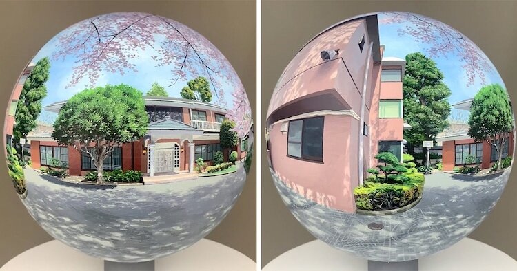 В отличие от скульптуры, традиционные картины обычно отражают один взгляд на предмет. Однако художник из Токио Дайсуке Самедзима применяет свой талант гиперреализма к нетрадиционному полотну. В своей серии Flatball он изображает мирные японские пригороды на трехмерных глобусах. В результате зрители могут буквально держать иммерсивную сцену в руках. Из-за сферической формы этих изображений они захватывают 36-градусный обзор каждого места. Таким образом, когда зритель переворачивает картину в руке, он увидит разные дома, улицы и другие достопримечательности, похожие на изображения, которые вы видите в Google Street View. Ни на одном из этих изображений нет видимых людей, что облегчает представление себя в этих фотореалистичных средах.Несмотря на трудности работы с круглой поверхностью, Самедзима способен поддерживать удивительно высокий уровень детализации в своих работах. Рендеринг на самом деле настолько точен, что поначалу трудно сказать, что он сделан красками и кистью, а не просто н
